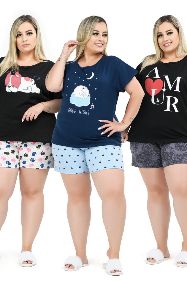 kIT com 3 Conjuntos pijama feminino Plus Size confeccionado com o melhor algodão penteado, tecido leve e muito confortável.